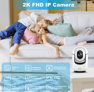 Câmera Interna 2K Wi-Fi 5G/2.4G, Color Visão Noturna, Áudio Bidirecional, Detecção por IA, Pan/Tilt 360°, Alarme com Sirene, Fio Monitor Bebê